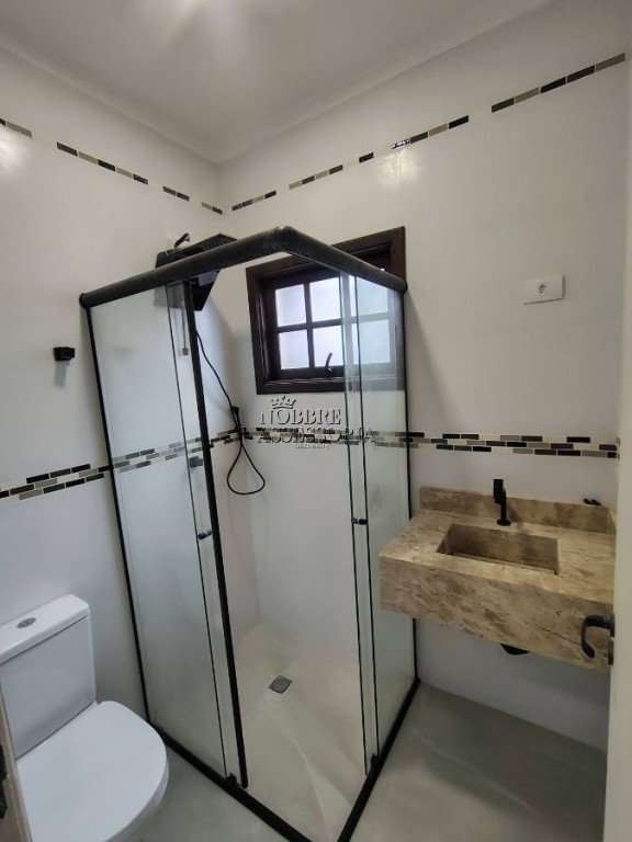 banheiro social, banheiros com box de vidro e chuveiro, acabamento em metais pretos, iluminação em